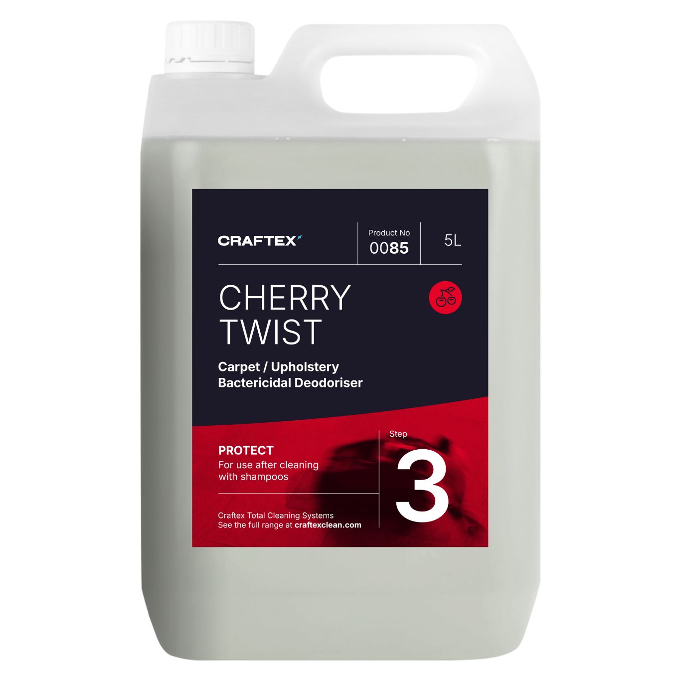 Craftex CHERRY TWIST BACTERICIDAL DEODORISER is a powerful agent which is safe to use on carpets, soft furnishings and all other wet-cleanable fabrics.