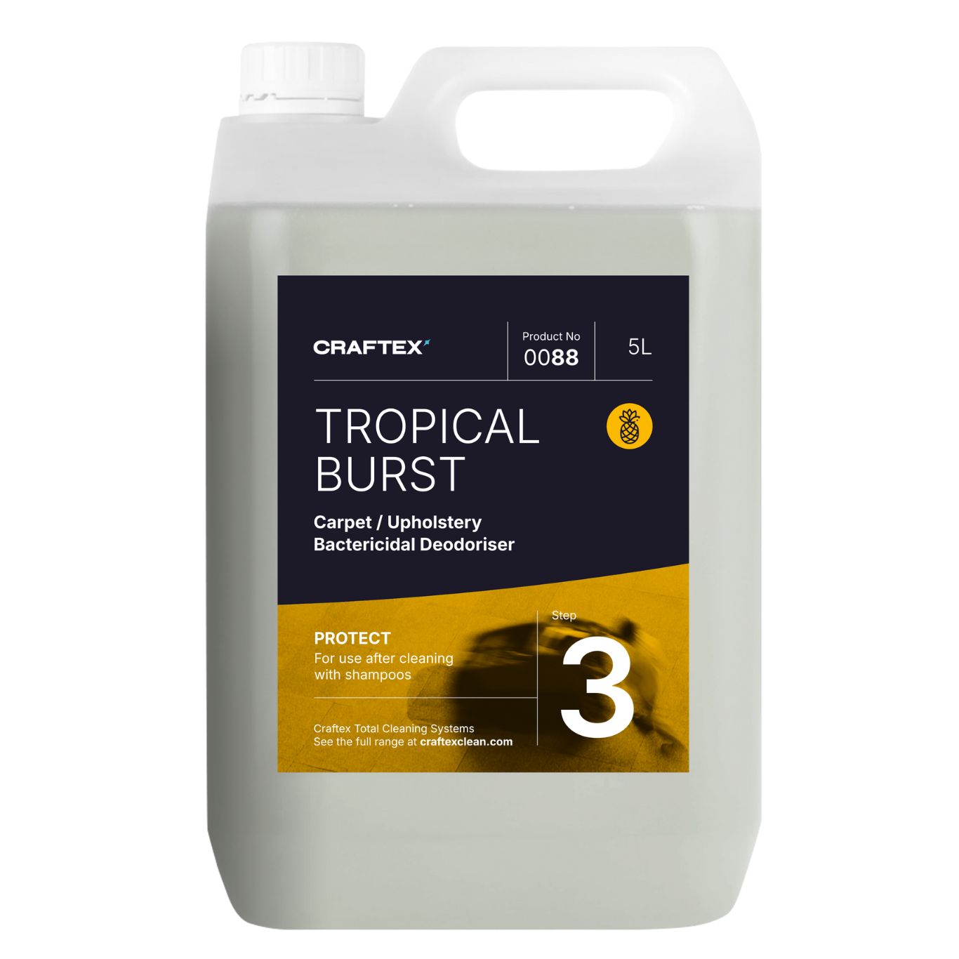 Craftex TROPICAL BURST BACTERICIDAL DEODORISER is a powerful agent which is safe to use on carpets, soft furnishings and all other wet-cleanable fabrics.