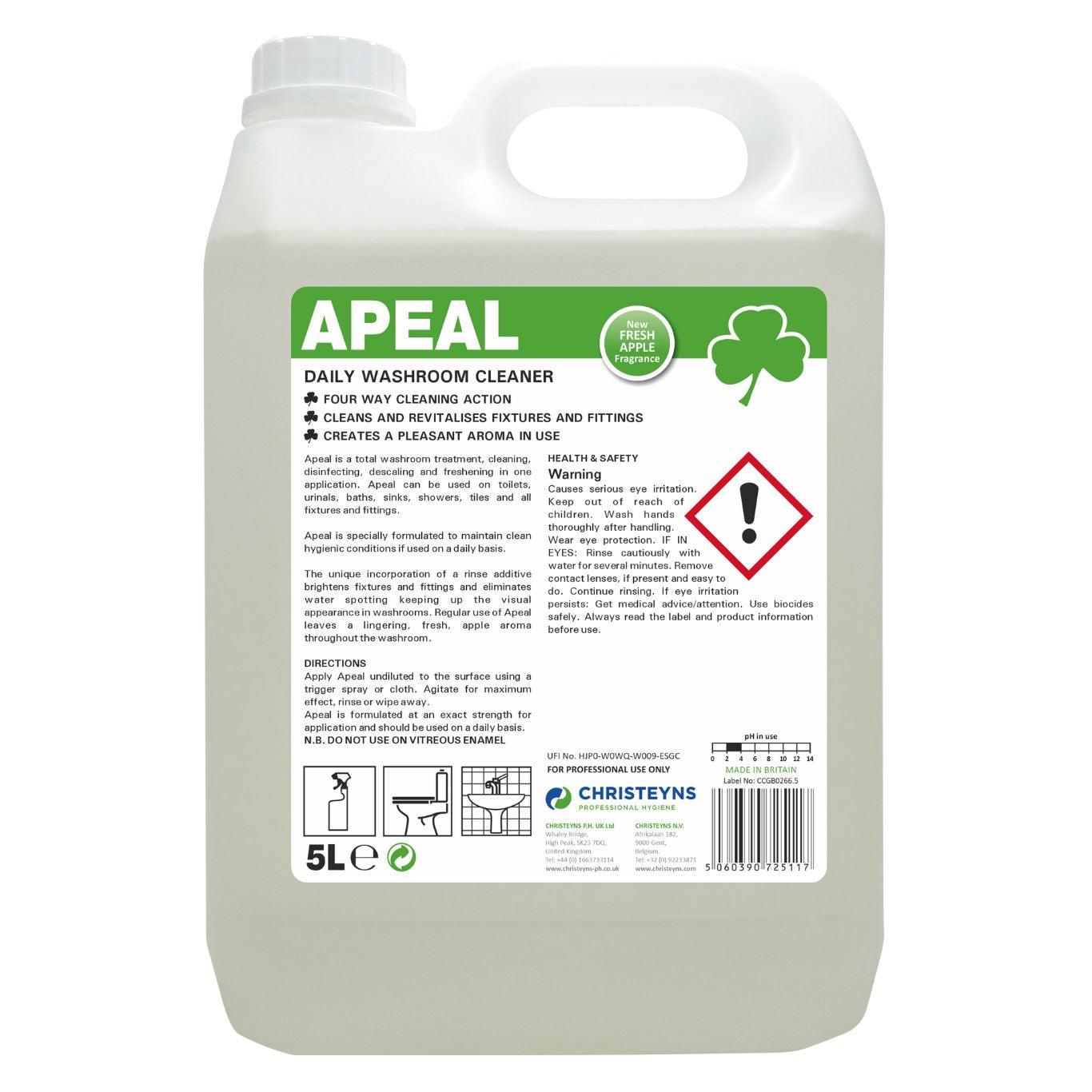 APEAL DAILY WASHROOM CLEANER is a ready to use toilet and washroom cleaner which creates a pleasant apple aroma as it cleans, descales, deodorises and disinfects.