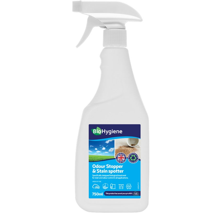 BioHygiene Odour Stopper & Stain Spotter 750ml utilises specialist enzymes to break down organic odours at the source and remove stains. This odour stopper and stain spotter is ideal for food-based spills like tea, milk, wine and sauces and human and pet accidents like vomit and faeces. BioHygiene products are designed to reduce CO2 emissions, aquatic and human toxicity.