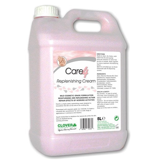 DIRECTIONS FOR USE: CARE4 is available in 5 litre and 1 litre bottles and a 300ml dispenser. If necessary, decant into a 300ml dispenser or use in conjunction with CLOVER CHEMICALS' bulk-fill dispensing system. Dispense directly onto dry hands and work into skin, ensuring maximum coverage.
