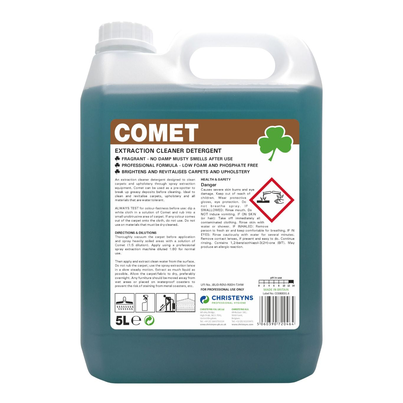 COMET EXTRACTION CLEANER is low viscosity, low foam and phosphate free, and leaves carpets and upholstery fragrant with no damp, musty smells after use. It is particularly recommended for use in pubs, clubs, hotels, nursing homes, offices, cinemas and car valeting businesses.