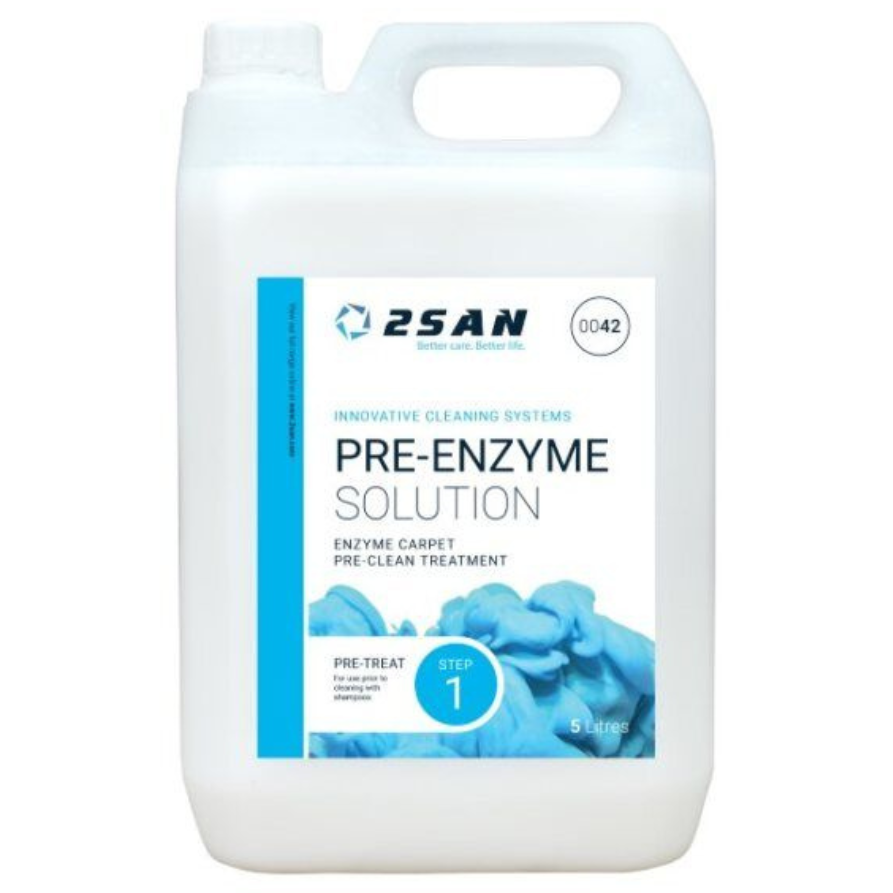 2SAN PRE-ENZYME SOLUTION is a prespray and spotter designed to digest protein-based stains and odours, including grease, blood, egg and other food. It is suitable for use on carpets, upholstery, mattresses and bedding.