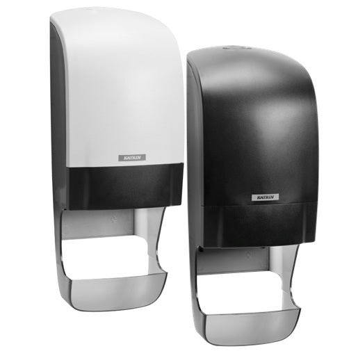 The Katrin System Toilet Roll Dispenser holds two system toilet rolls. The rolls are available in either 2ply recycled paper or a 2ply luxury pure tissue.