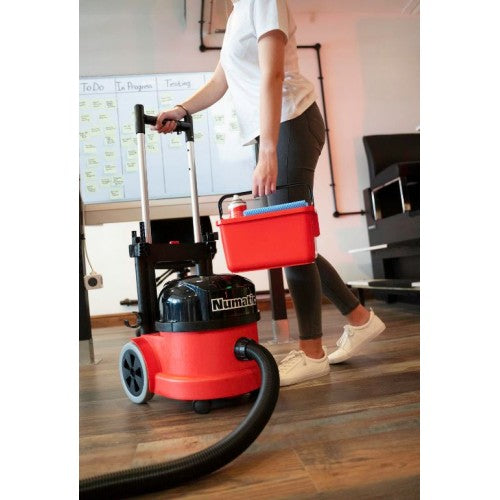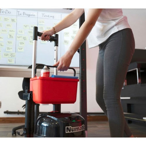 The NUMATIC PBT230NX cordless trolley vacuum cleaner combines the efficiency of cordless dry vacuuming with the convenience of an incorporated storage trolley, which can be used to transport a second charged battery, as well as usefully caddying cleaning materials.