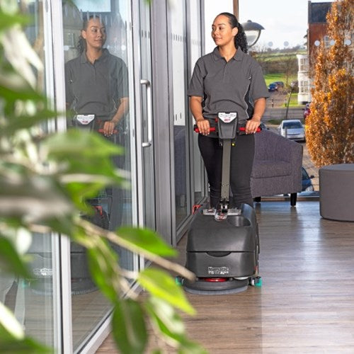 The Numatic TTB1840NX-R battery scrubber dryer features a high performance digital motor, powerful NX300 36v lithium battery and patented centrifugal water feed on the brush.