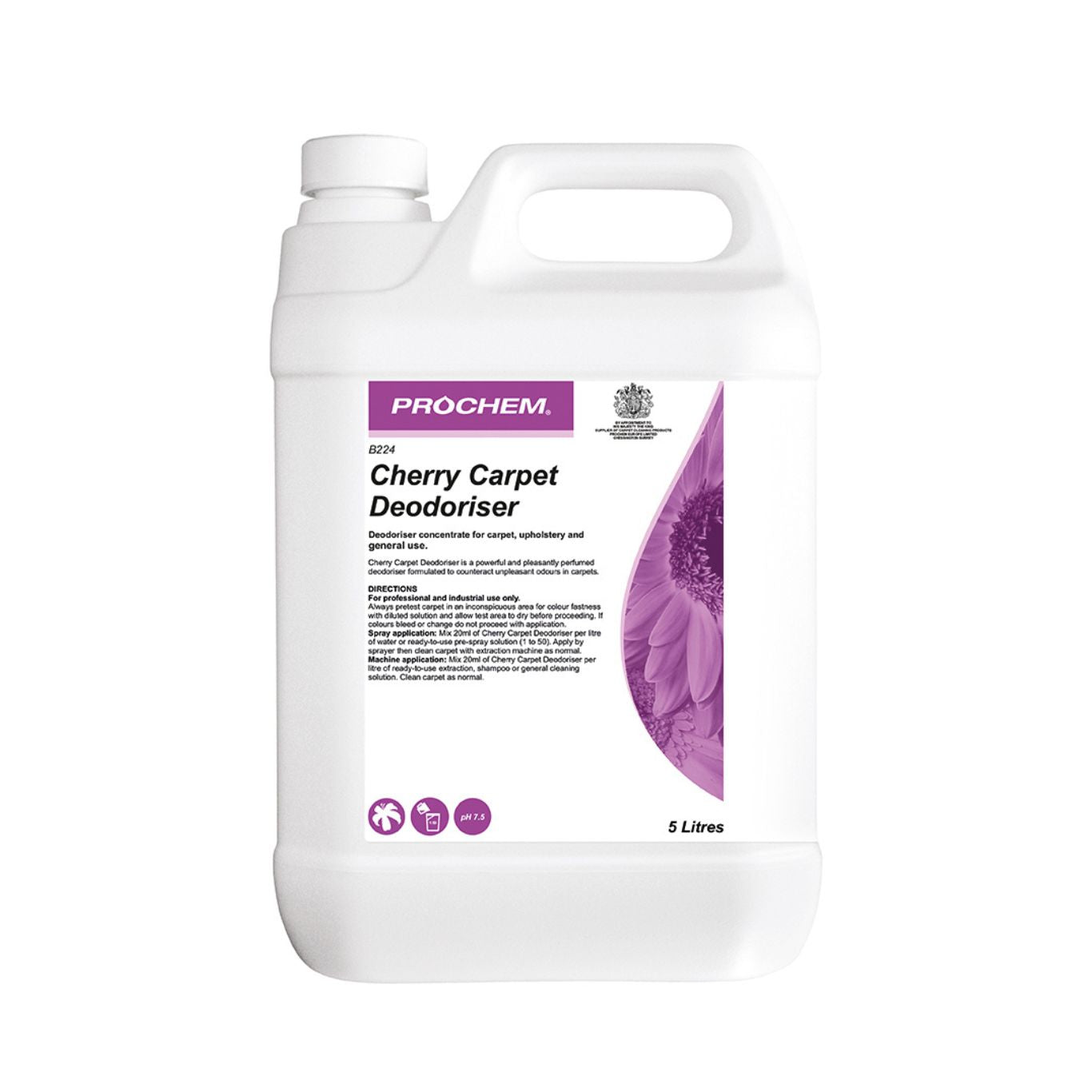 PROCHEM CHERRY CARPET DEODORISER is a powerful, pink liquid deodoriser formulated to destroy unpleasant odours in carpets and leave a pleasant cherry fragrance.