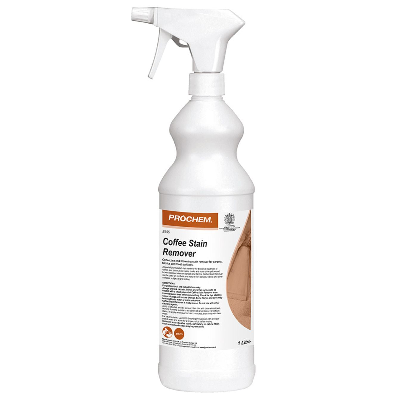 PROCHEM COFFEE STAIN REMOVER is a professional, ready to use spotter stain remover for direct treatment of tea, coffee, beer, tannin and water mark staining on fabrics and carpets. Suitable for synthetic and natural fibres, this clear, acidic liquid leaves a fresh lemon fragrance.