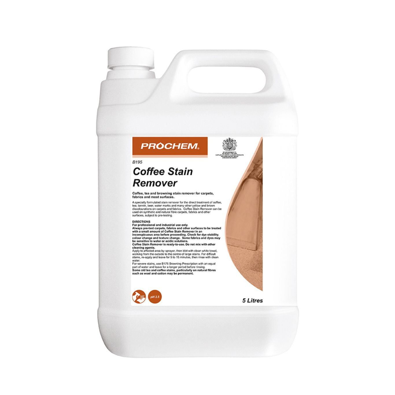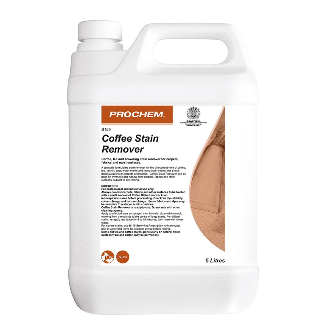PROCHEM COFFEE STAIN REMOVER is a professional, ready to use spotter stain remover for direct treatment of tea, coffee, beer, tannin and water mark staining on fabrics and carpets. Suitable for synthetic and natural fibres, this clear, acidic liquid leaves a fresh lemon fragrance.