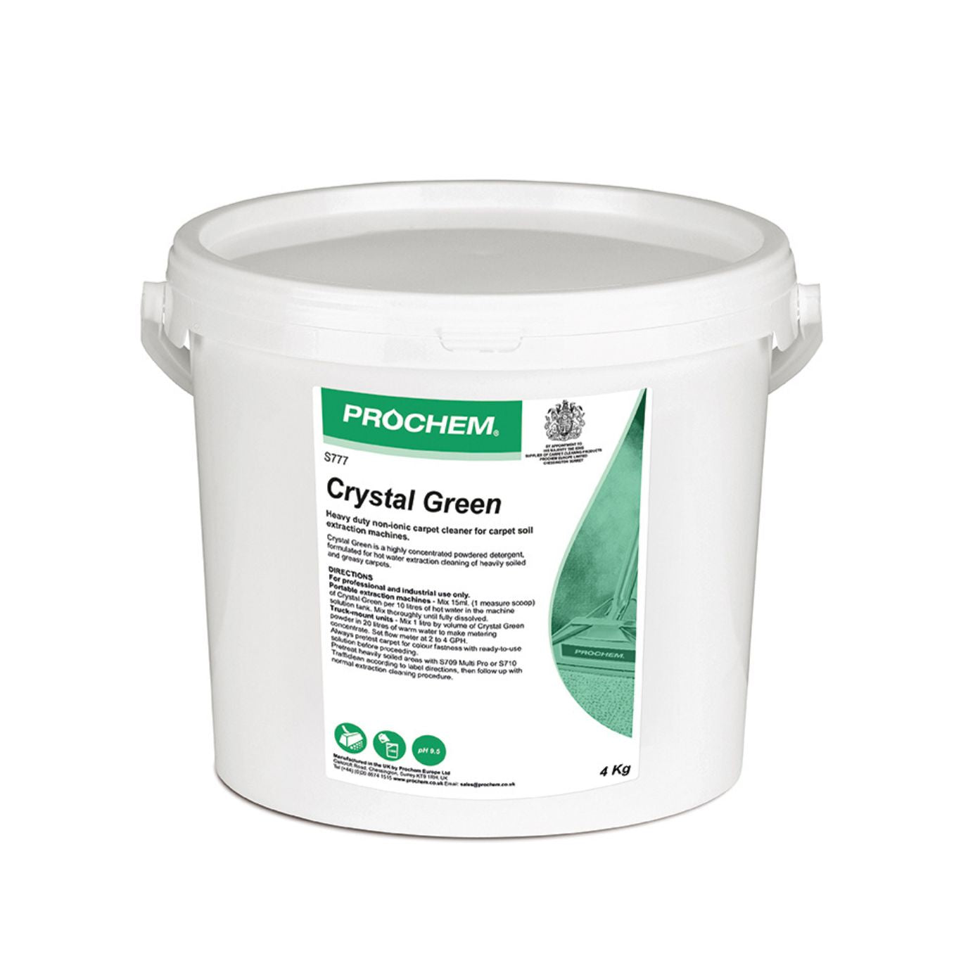 DIRECTIONS FOR USE: Pre-test on an inconspicuous area of carpet for colour-fastness. For use in portable extraction machines, dilute 1 x 15ml scoop with 10 litres of hot water in the solution tank. For truck mount units mix 1 kilo of CRYSTAL GREEN with 20 litres of warm water and set flow meter at 2 to 4 GPH. Heavily soiled areas should be pre-treated with PROCHEM S709 MULTI PRO or PROCHEM S710 TRAFFICLEAN.