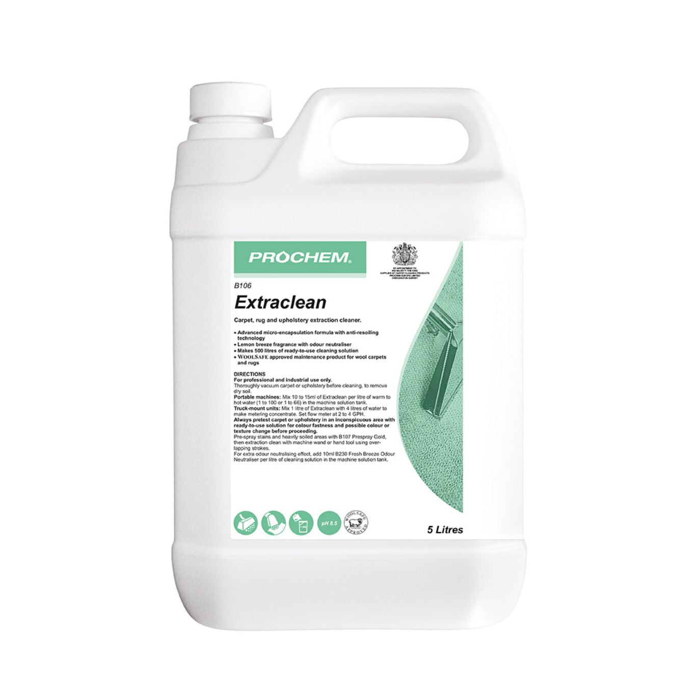 Prochem Extraclean, product code B106, an advanced formula upholstery and carpet cleaner, for use with an extraction cleaner. It features micro-encapsulation technology, which neutralizes odours, leaving a fresh lemon breeze.