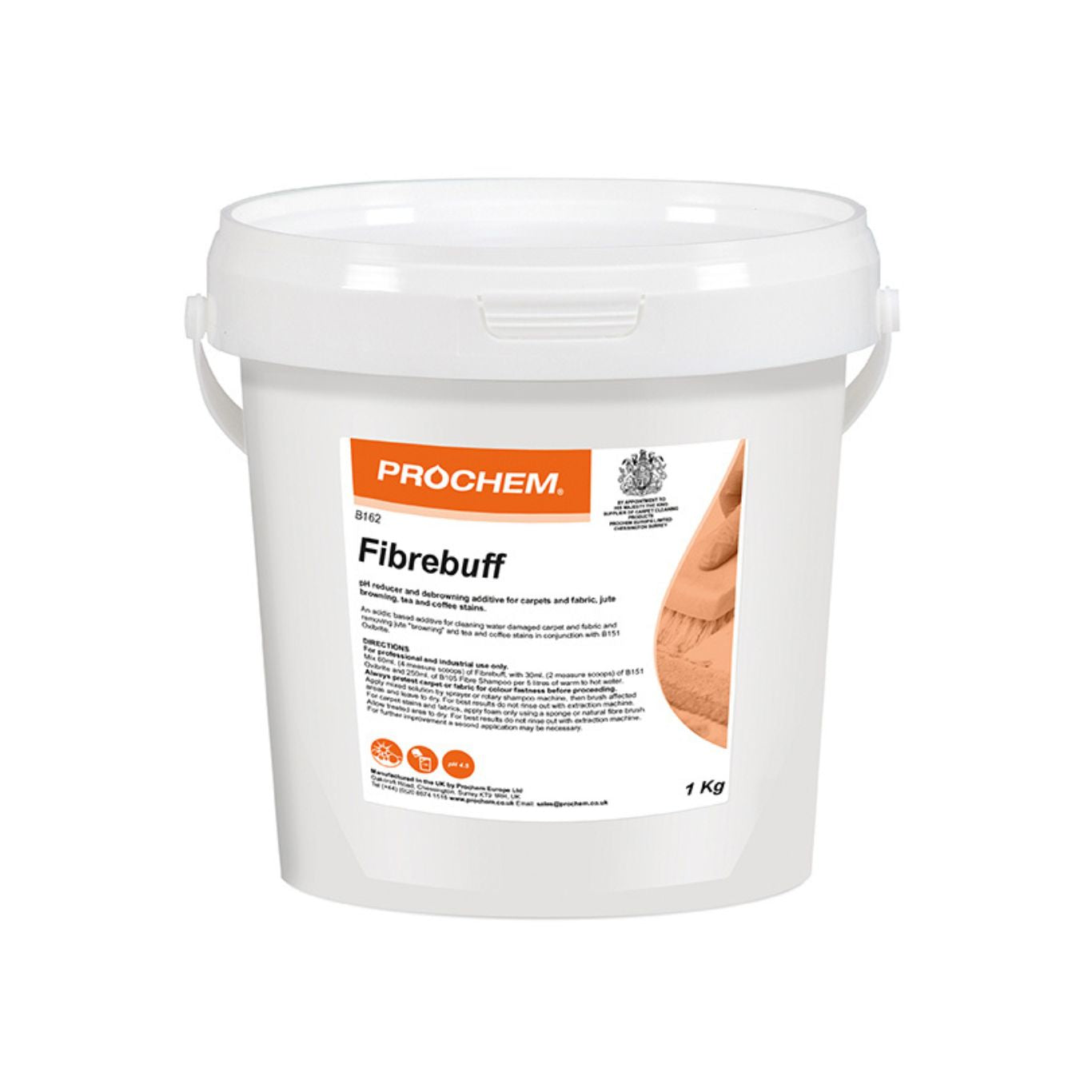 FIBREBUFF is an acidic based powder additive for professional industrial use, to clean water damage, browning and tea and coffee stains from carpets. For use in conjunction with PROCHEM OXIBRITE and PROCHEM FIBRE SHAMPOO.