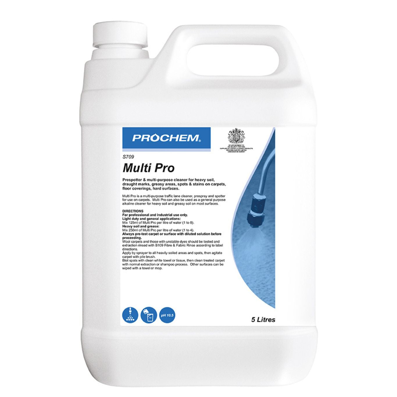 MULTI PRO is a professional carpet pre-spray and spotter, specially formulated for use in high traffic and greasy lanes. Also highly effective as an alkaline general purpose cleaner for heavy and greasy soiling on most surfaces.
