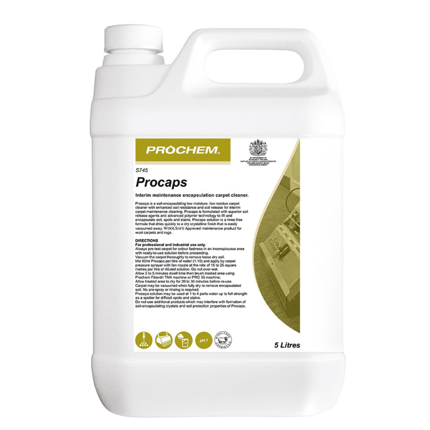 DIRECTIONS FOR USE: Always pre-test on an inconspicuous area with prepared solution for colour-fastness. Vacuum carpet before use. Dilute PROCAPS at a rate of 1:16 and apply using a pressure sprayer without overwetting. Leave for 2-5 minutes before brushing with a PROCHEM machine. Vacuum carpet when fully dry. PROCAPS can be used as a pre-spotter for spots and stains, diluted at a rate of 1:4.
