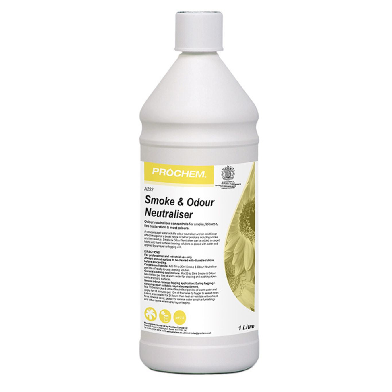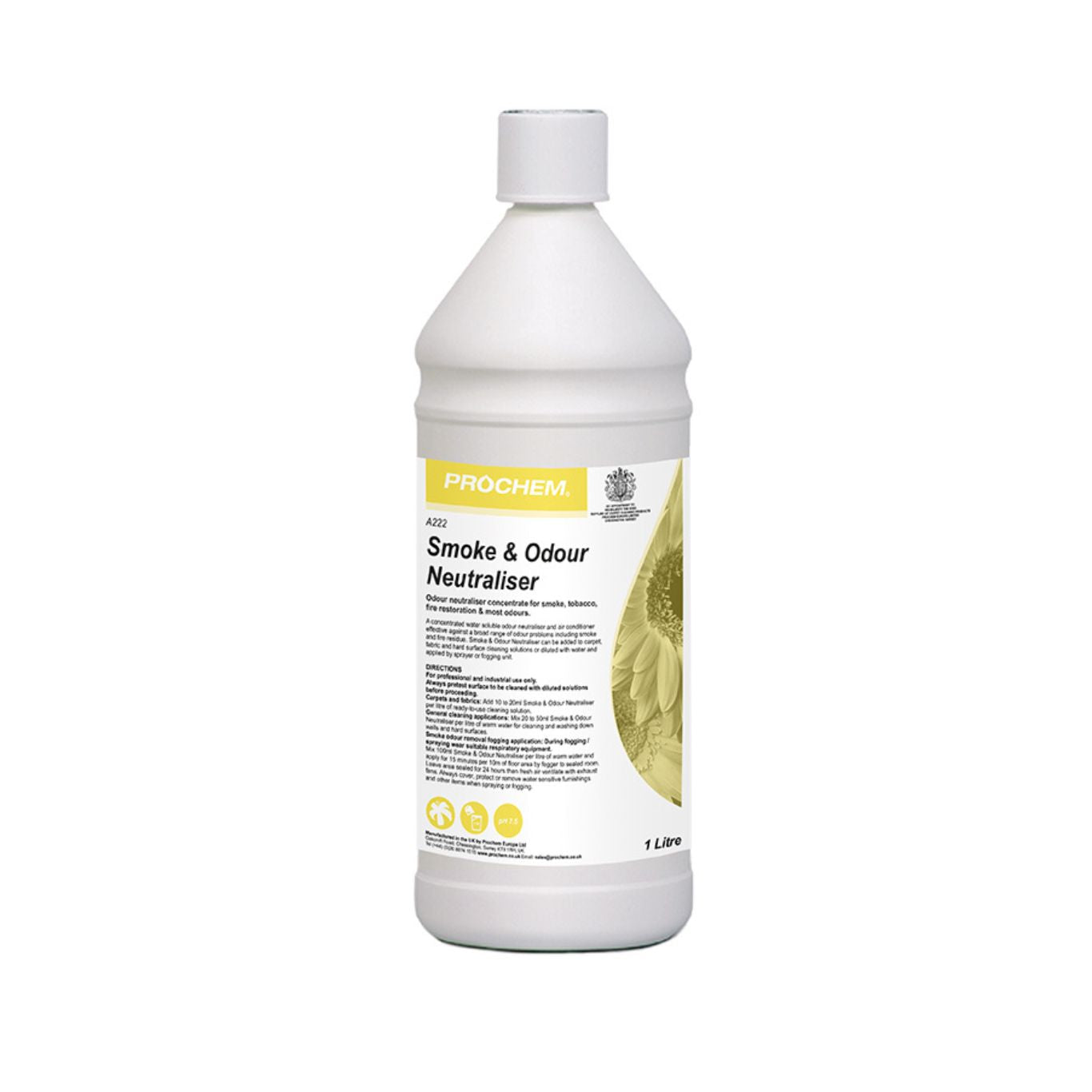 PROCHEM SMOKE AND ODOUR NEUTRALISER is a concentrated odour neutraliser and air conditioner which is solvent and bactericide free, water soluble and highly effective for a range of odours including smoke and fire residue. It is suitable for use on carpets, fabrics and hard surfaces.