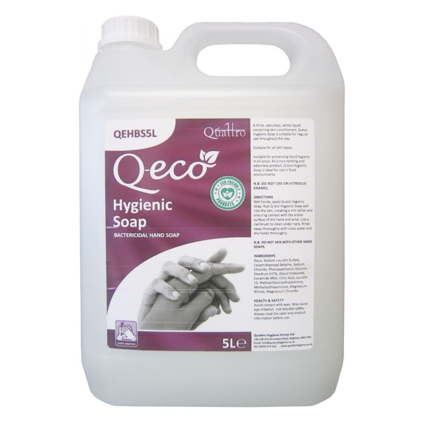 Q-Eco Hygienic Soap, by Quattro Hygiene, is an easy-rinse, non-tainting, water-based, bactericidal hand soap. It contains mild skin conditioners and is foam controlled for ease of use. This odourless liquid soap can be used throughout the day.