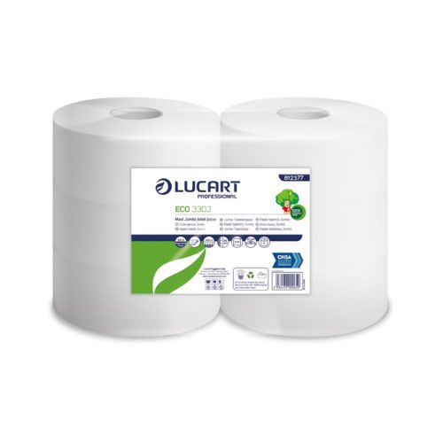 Lucart 812377 Recycled Jumbo Toilet Rolls are supplied in packs of 6; each 2-ply roll measures 300m x 86mm with a 2.25" core.