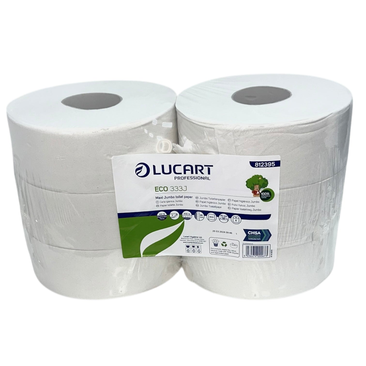 Lucart 812395 JUMBO TOILET ROLLS are supplied in packs of 6; each 2-ply roll measures 300m x 86mm with a 3" core.