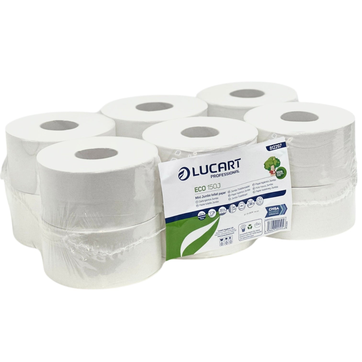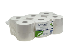 Lucart 812297 MINI JUMBO TOILET ROLLS are supplied in packs of 12; each 2-ply roll measures 150mm x 86mm with a 2.25" core, and is 150 metres in length.