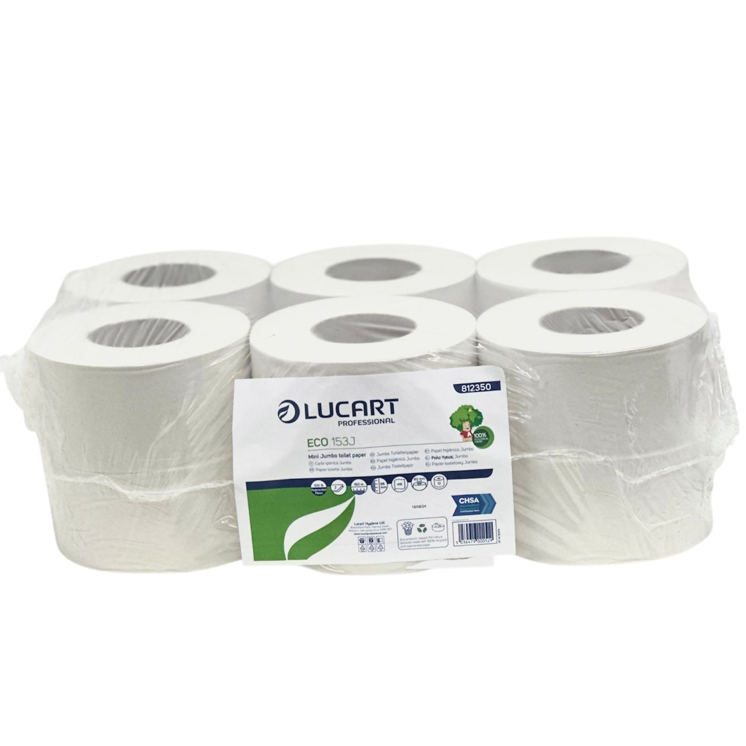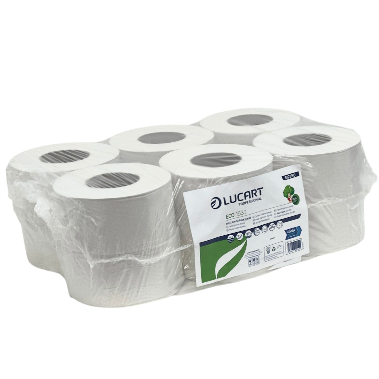 Lucart 812350 MINI JUMBO TOILET ROLLS are supplied in packs of 12; each 2-ply roll measures 150mm x 86mm with a 3" core, and is 150 metres in length.