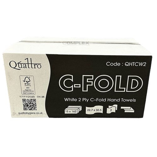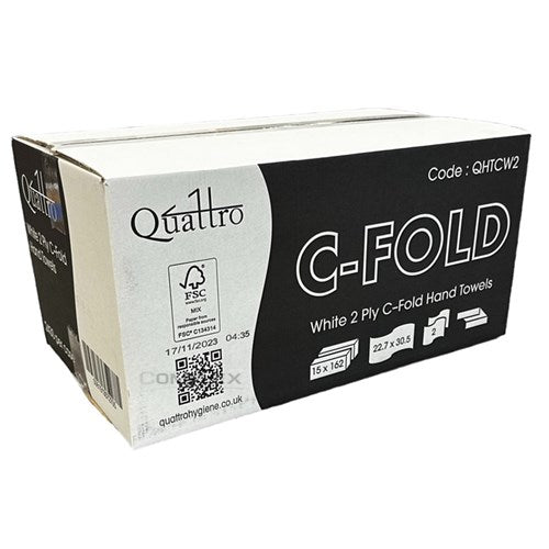 The Quattro Premium C-fold hand towel is a pure cellulose 2ply hand towel. Each towel measures 22.7x30.5 cm when open. A case has 15 sleeves of 162 towels per sleeve, a total of 2430 towels per case.