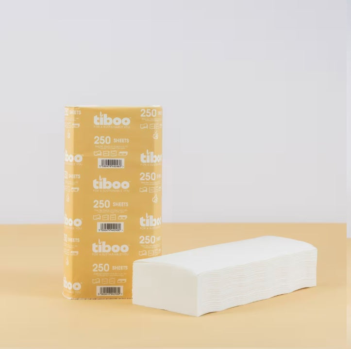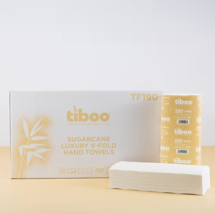 White Premium 2ply V-fold Hand Towel, product code T135/3000. This premium hand towel is made from sustainable Sugarcane, using the left over cane after sugar production. The Sugarcane hand towel has 64% lower carbon footprint than recycled paper hand towels.