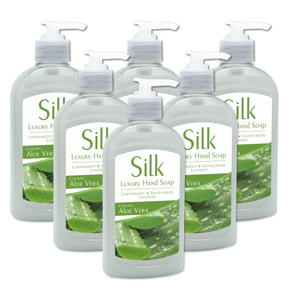 SILK LUXURY HAND SOAP is a pearlised, cosmetic-grade hand soap which contains Aloe Vera and Almond Oil, leaving a subtle, almond blossom fragrance.