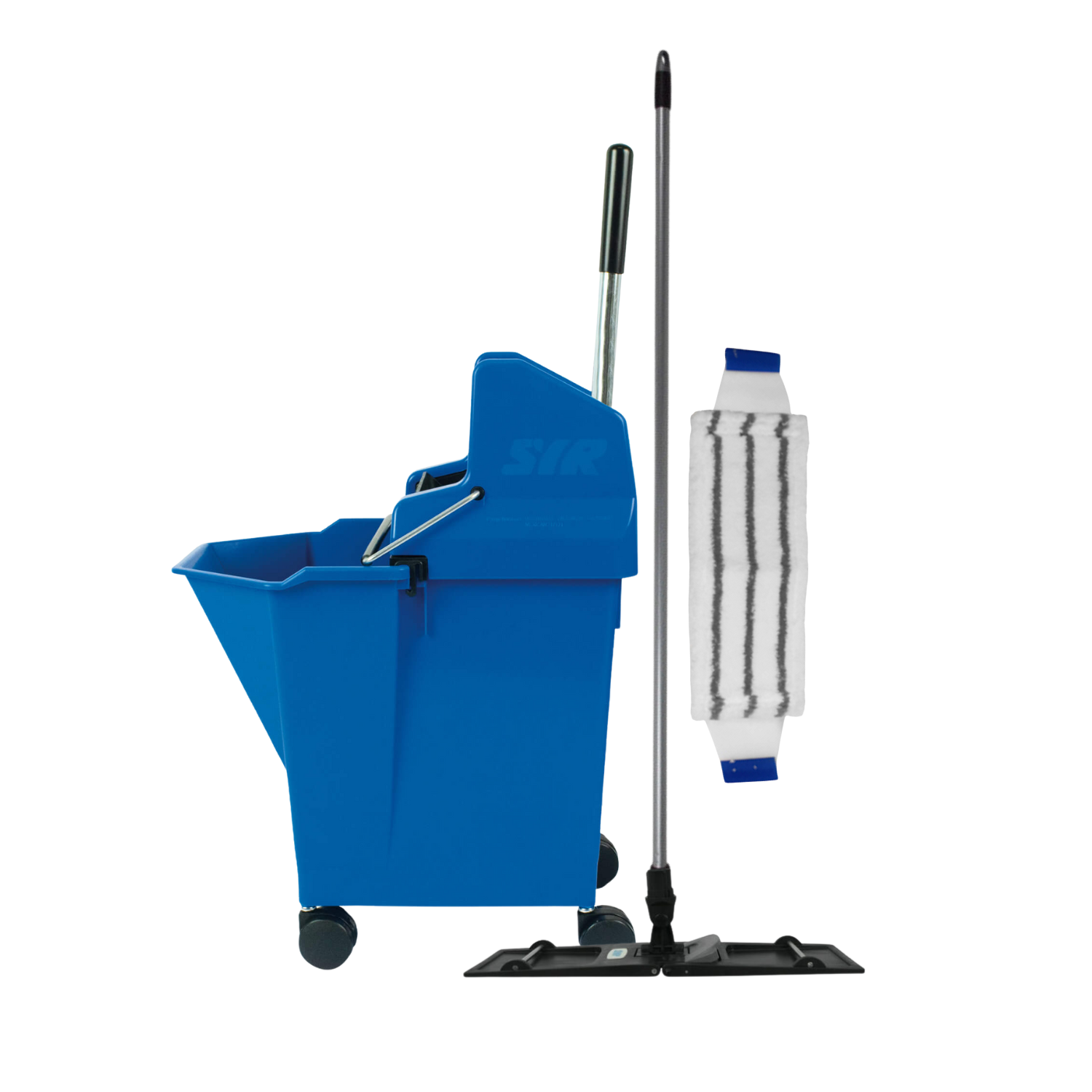 The SYR Flat Mopping Kit is the perfect choice for flat mopping. The SYR Duo Press bucket is a heavy duty, moulded plastic bucket, which is highly portable and ideal for small to medium areas. The bucket has a 15 litre capacity and 2” castors.
