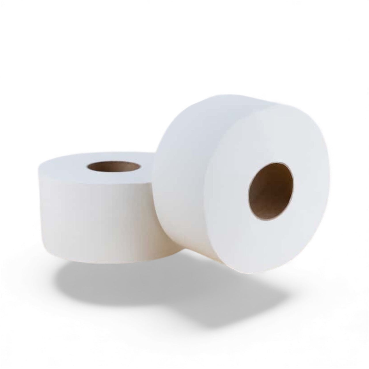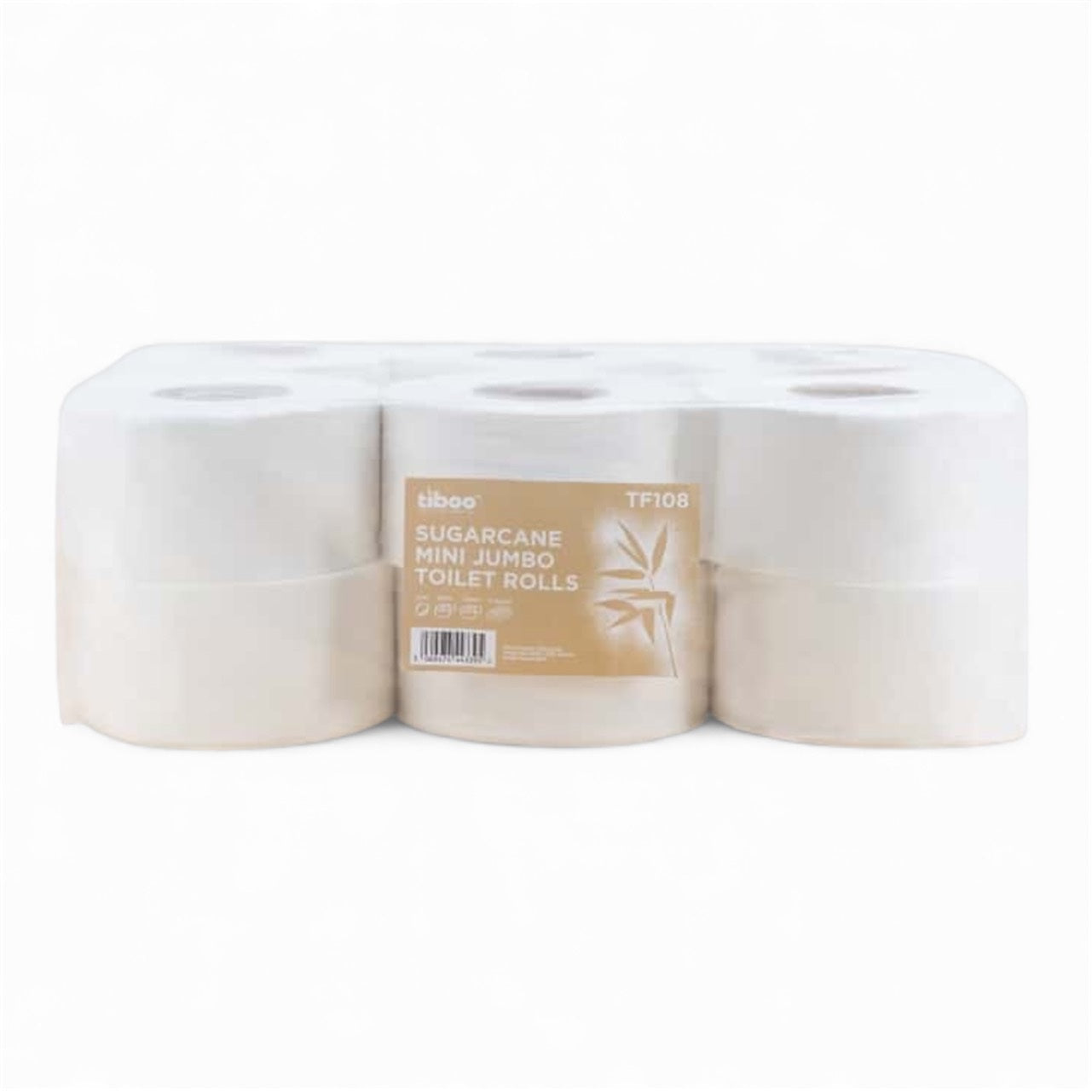 Tiboo's Sugarcane Mini Jumbo Toilet Rolls are available in either 150 metres or 200metres in length and packed 12 rolls per recyclable wrap, ideal for busy environments such as schools, cafes and restaurants etc. .