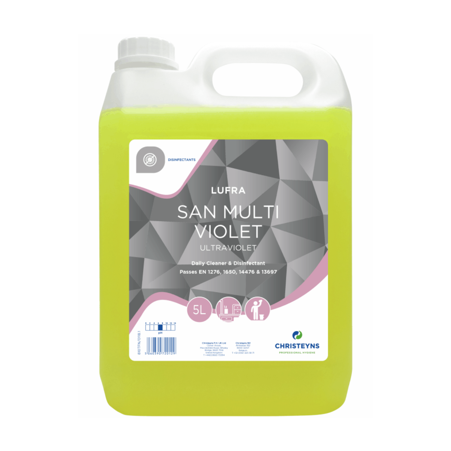 Lufra San Multi Violet is an effective neutral cleaner and disinfectant which is safe to use on all hard surfaces and leaves a pleasant and popular violet fragrance.