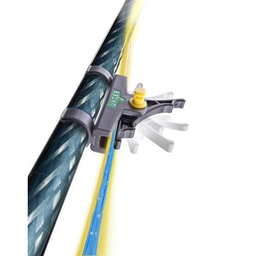 The HIFLO CONTROL SWITCH works by clipping onto the pole using the NLITE clips or optional velcro fasteners, the hose is fed through the switch's channel and the trigger then squeezes and releases the hose to control water flow; can also be shut off completely.