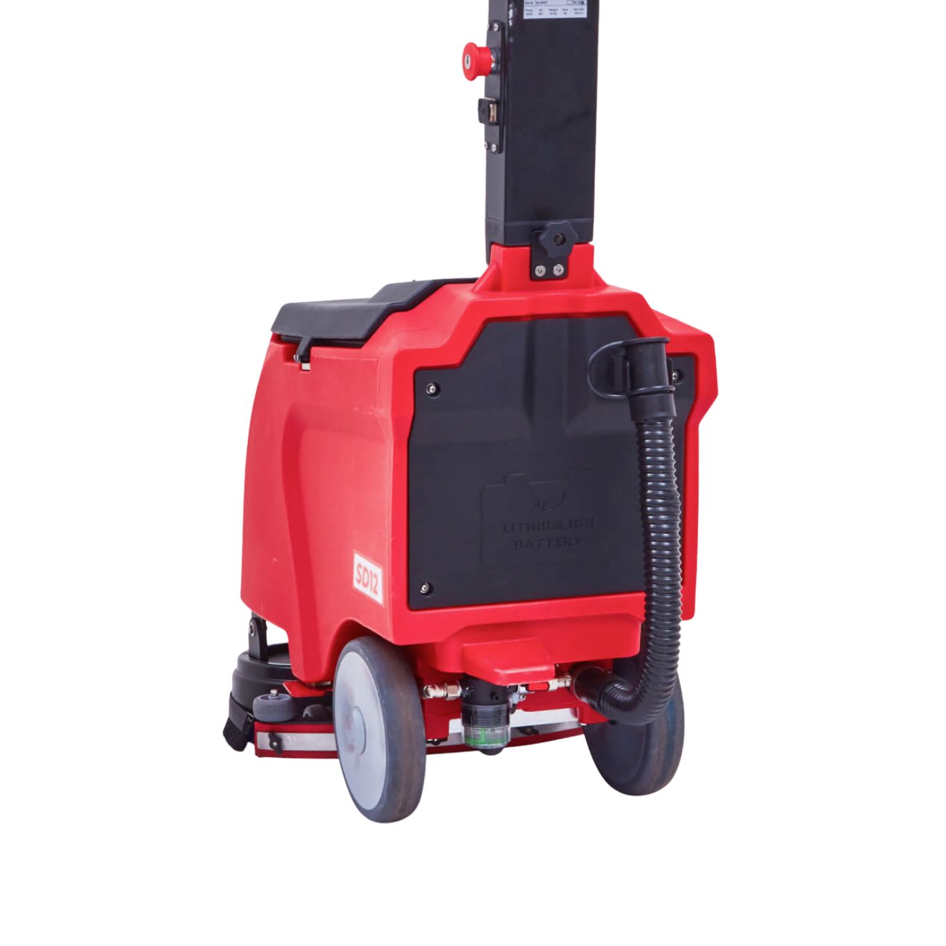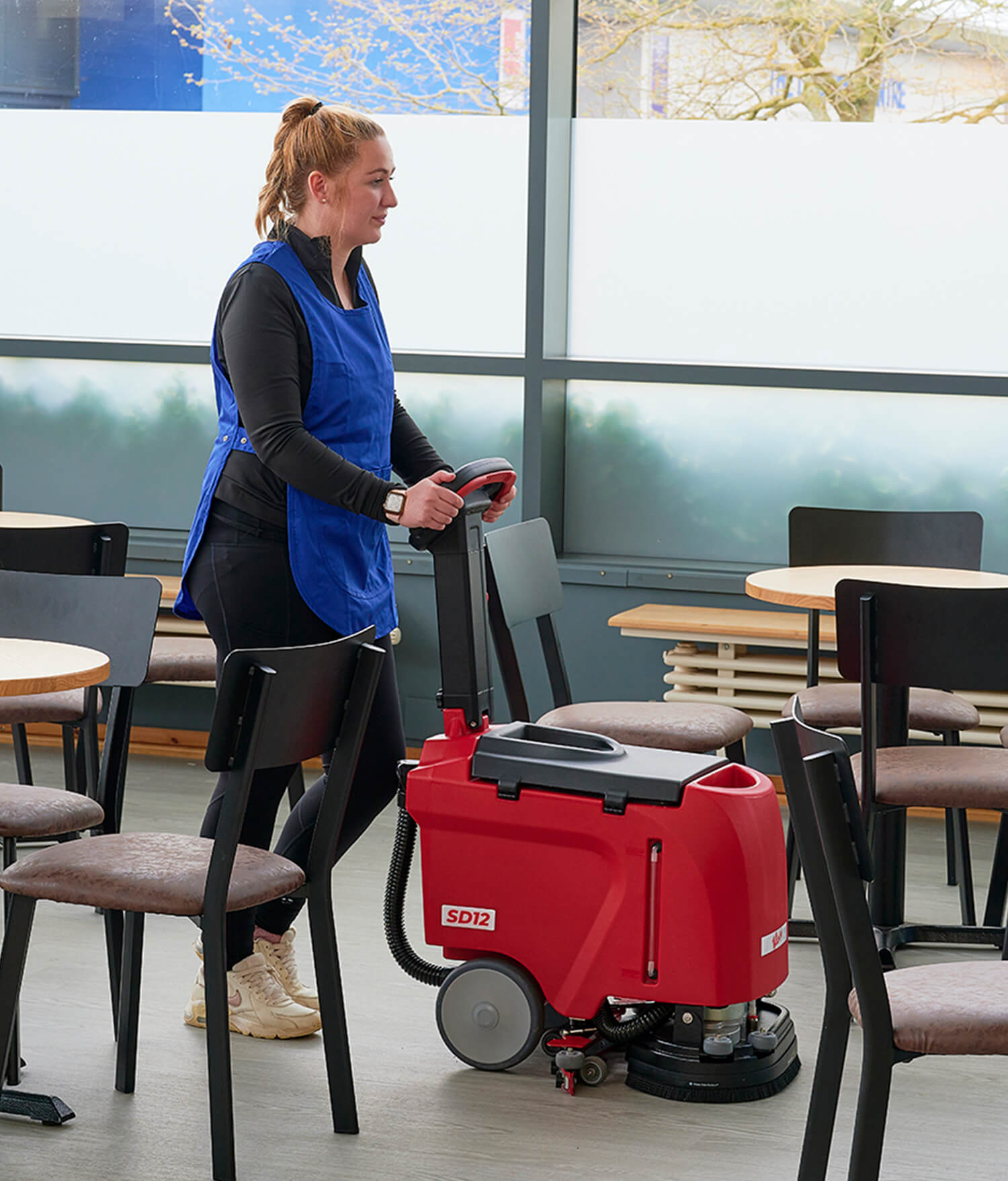 The SD12 is the perfect compact scrubber dryer for cleaning hard floors from 250 - 500 m2 and can clean up to 1600 m2 on a single charge. The front mounted brush head increases visibility when operating allowing the operator to see their working area, as well as being able to get the brushes closer to corners and edges. The patented toothed brush design has simplified the transmission to a single motor, therefore increasing productivity and reducing costs. The SD12 has been engineered to be simple to maintain. Routine maintenance tasks such as squeegee replacement, cleaning the clean water filter and replacing brushes is quick and easy. The wide opening of the recovery tank makes it easy to access and clean.