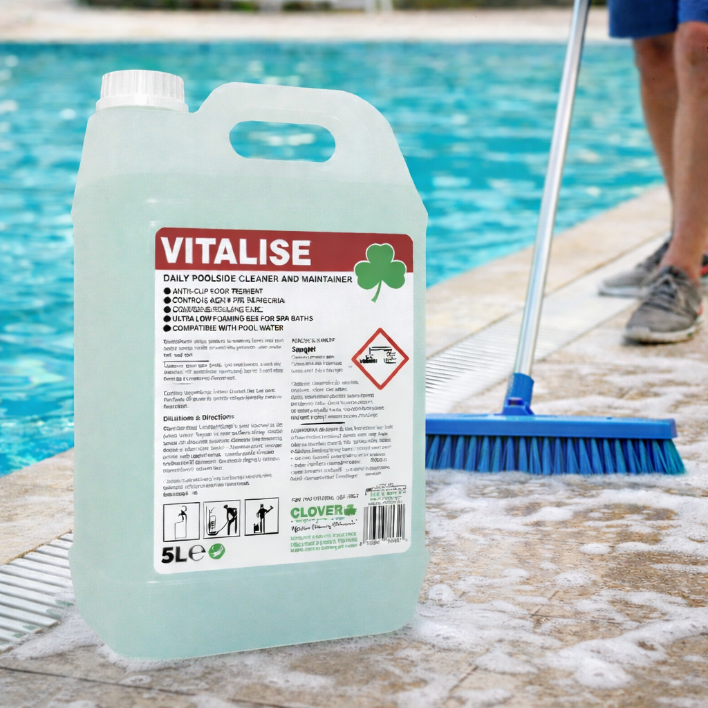 VITALISE DAILY POOLSIDE CLEANER/MAINTAINER is a blend of low foaming agents and surface safe acids formulated to control water scale, body fats and bacteria, ensuring hygienic, slip resistant cleaning to poolside areas, wet areas and jacuzzies.